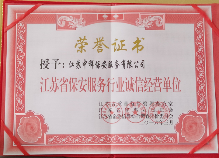 江蘇中祥保安公司榮獲江蘇省保安服務(wù)行業(yè)誠(chéng)信經(jīng)營(yíng)單位
